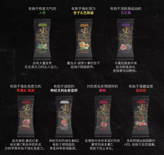 Made from natural ingredients, the "3B Bar" is a nutritious, high-quality snack that uses plant-based ingredients from clean area of Europe, no added sugar or other chemicals, and is low in calories and gluten-free, and its packaging and assembly process are fully managed by experts. "3B Bar" contains a variety of recipes and flavors, such as Ginseng, figs, cherries and so on, which are very beneficial to health. In addition, its production meets the highest international quality standards. They are very strict with food safety and product taste control, and have invested a lot of money in the construction of plant facilities to ensure the quality of products, health and safety.