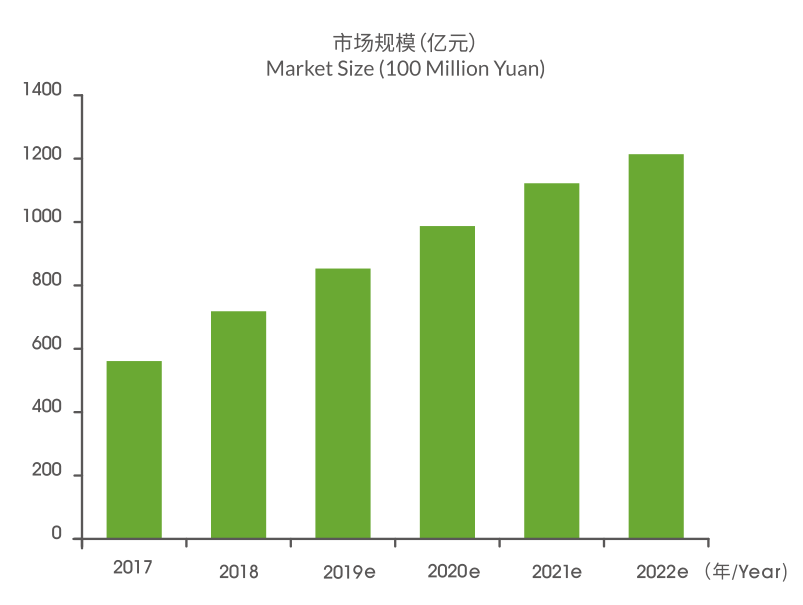 China's meal replacement market started late, but with the continuousdevelopment of China's economy and consumers’ increasing attention to healthyeating, the market has shown a strong upward trend, maintaining an annualgrowth rate of more than 30% during the passed years. China's food consumptionis in a critical period of structural upgrading. Food is no longer just a product tosatisfy people's basic living needs, therefore, food consumption is developingtowards "snack-oriented" and "entertainment-oriented". Meal replacement foodaims to satisfy demands of people in fast-paced life for high-quality products, andtries to find a balance between fast food and nutrition. China's meal replacementindustry is developing at a rapid speed. The market size of meal replacement inChina was about 57.17 billion yuan in 2017 and is expected to reach 120 billionyuan by 2022, according to Euromonitor International.