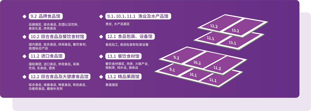 品牌食品馆、综合食品及餐饮食材馆、进口食品馆、精品果蔬馆、大健康食品馆、渔业及水产品馆、食品包装设备馆等10大展馆