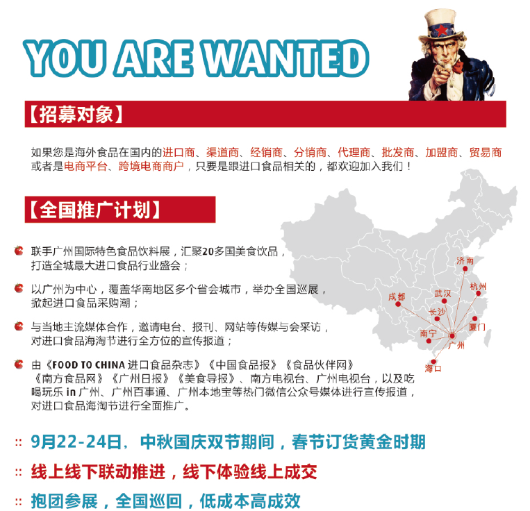 最给力的食品行业协会支持 广东省进口食品协会组织会员参观展会,预先为展商对接采购商和渠道商,同时携手中国第一本B2B《FOODTOCHINA》进口食品杂志为展商做宣传报道。