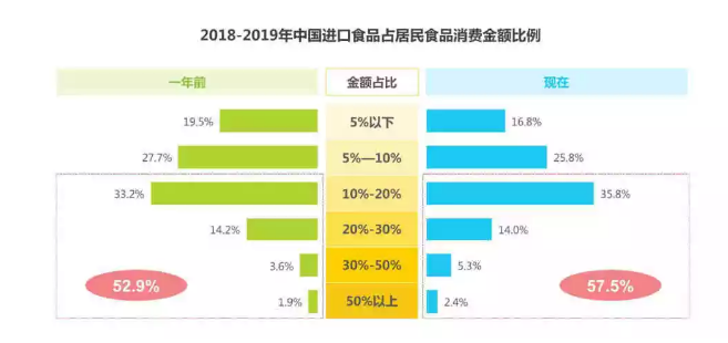 中国市场消费者对于进口食品的消费能力正在快速提高,进口食品市场在未来的发展潜力十分巨大。进口食品不再是奢侈的象征,而是逐渐融入居民的日常生活中,被越来越多消费者所接受。当前,57.5%的消费者在进口食品上的消费金额占整体食品消费的比例超过10%,比一年前增长了近5%。
