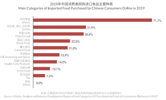 According to the statistics of Guangdong Customs, in 2017, Guangdong ports alone (excluding Shenzhen and Zhuhai) imported about 120,000 tons of snacks such as cakes, biscuits, candies, chocolates and dried fruit preserves from more than 60 countries and regions including the European Union, ASEAN and the United States, amounting to 230 million US dollars, a year-on-year increase of 50% and 18% respectively. Chinese consumers' fondness for imported snacks is the main reason for such a large import volume. "Analysis and Industry Development Report of Hot Categories of China Imported Food at E-commerce Platforms in 2019" from iiMedia shows that 71.7% of Chinese respondents in 2019 have bought imported leisure food, accounting for the largest proportion of the main categories of imported food purchased online. Among them, 42% of consumers said they would be willing to spend their money on imported snacks they hadn't eaten before. In addition, with the increasing varieties of online shopping modes, consumers have been able to conveniently purchase all kinds of imported snacks from various channels, with up to 75% of consumers reporting having purchased snack products from different e-commerce platforms, while 34% of consumers said they would buy snacks from imported food stores, 19% from foreign websites and 28% from local shops when travelling.