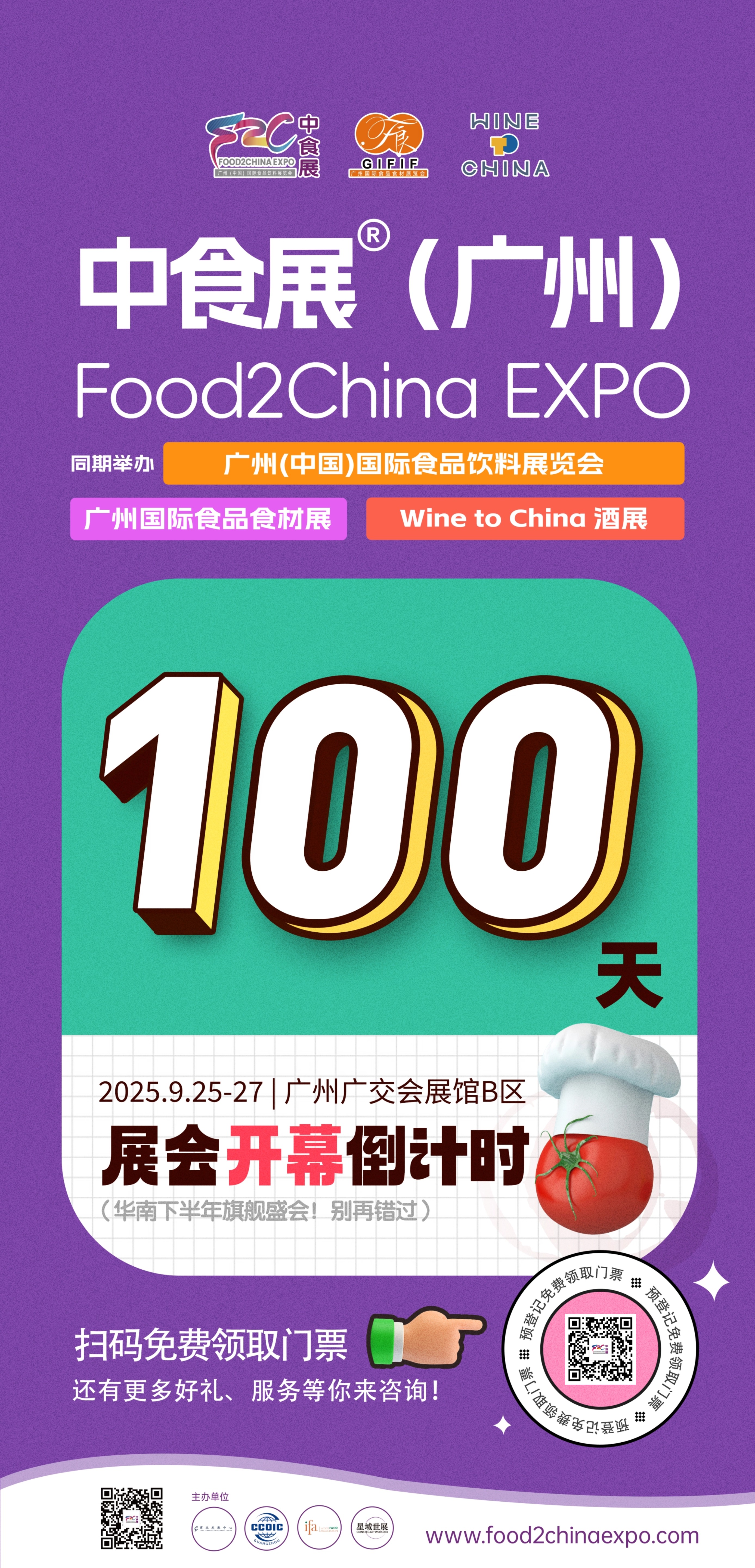 The countdown to the grand opening of the 中食展®广州2025Food2China Expo officially begins 100 days from now!