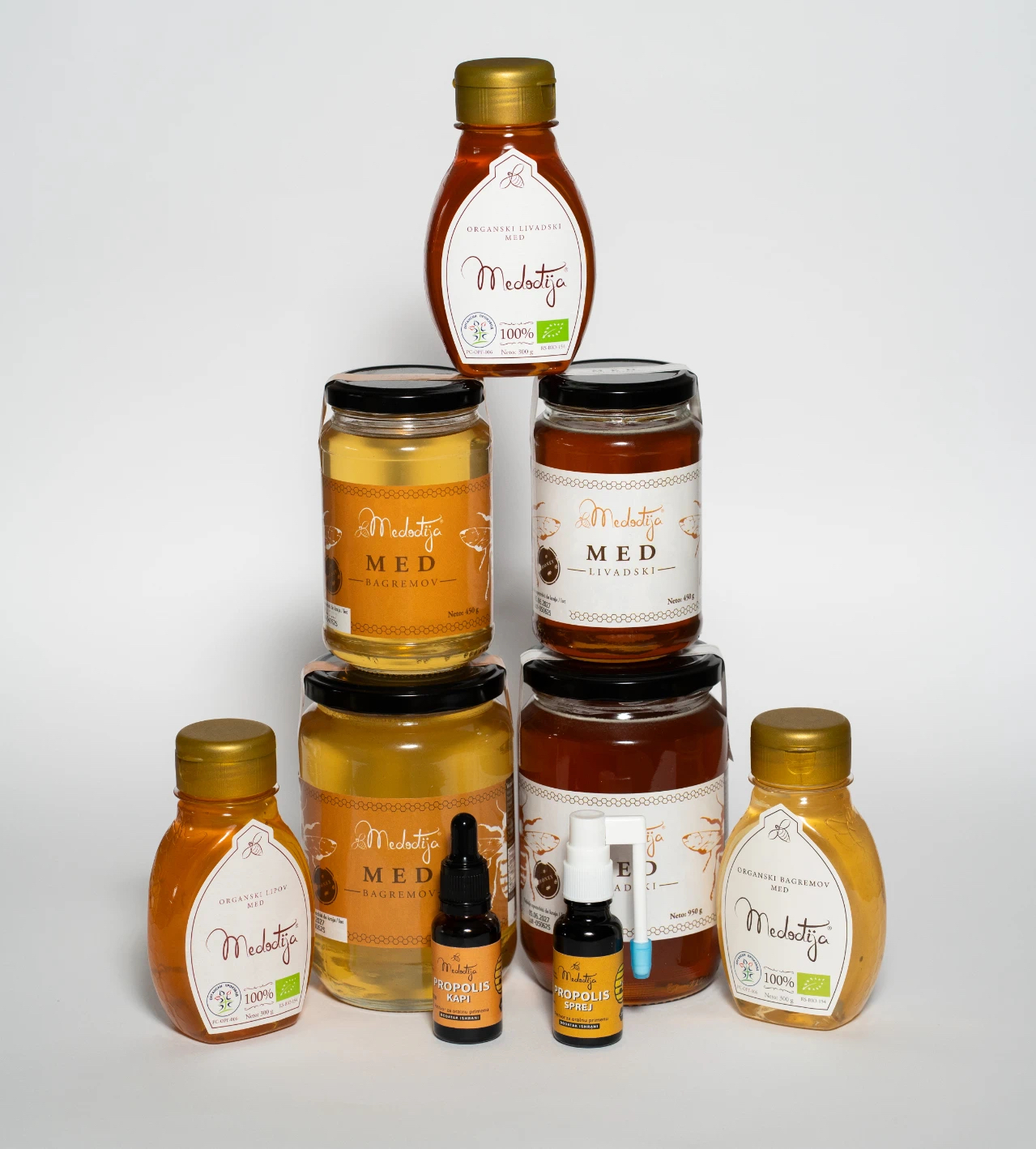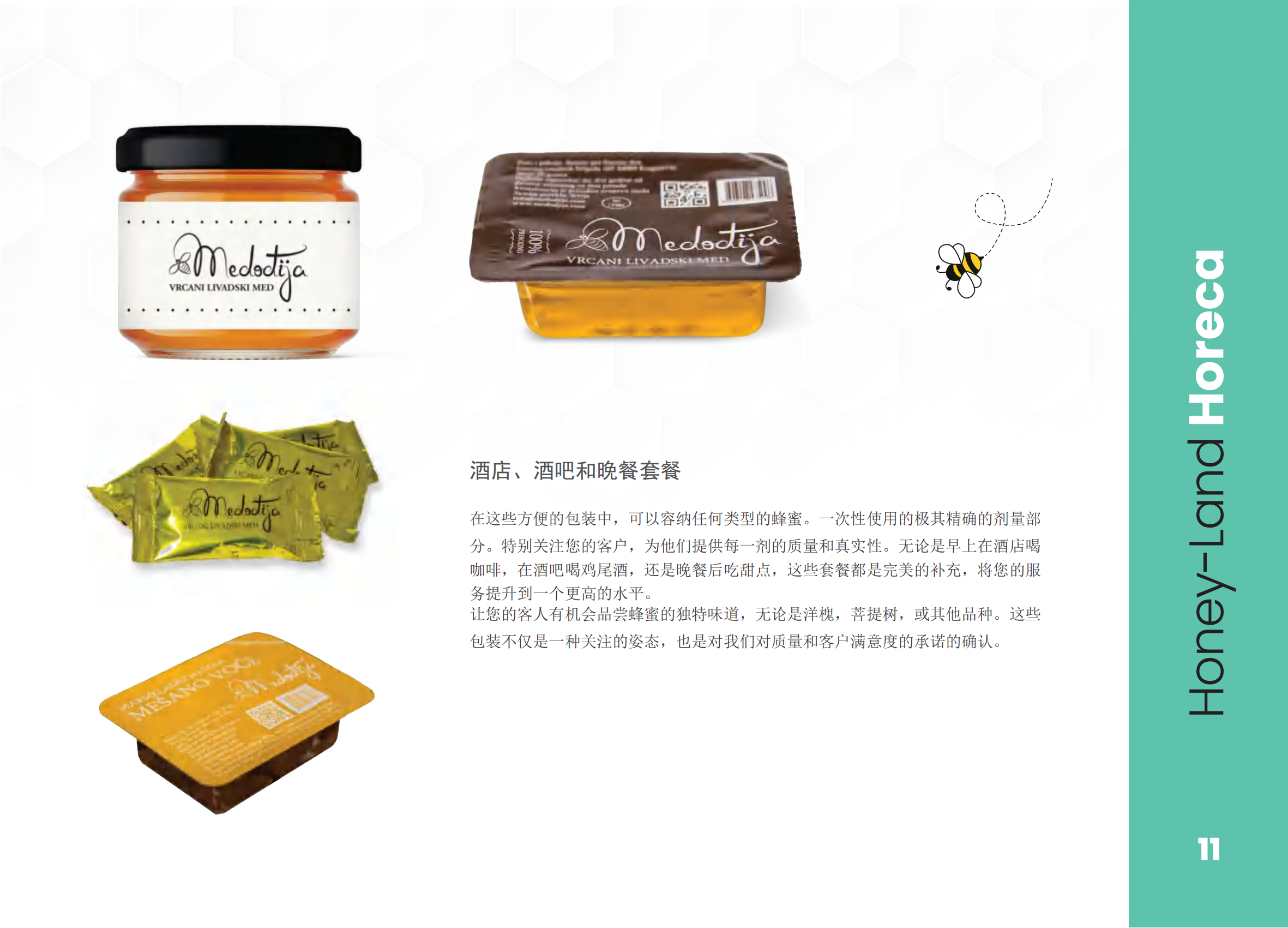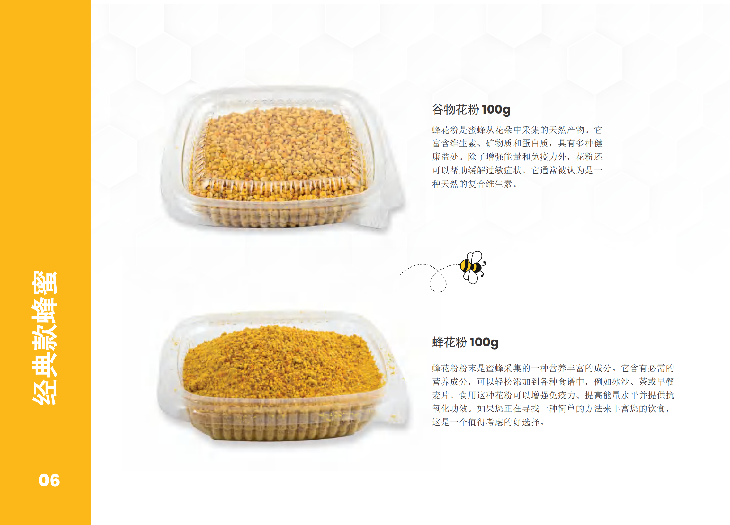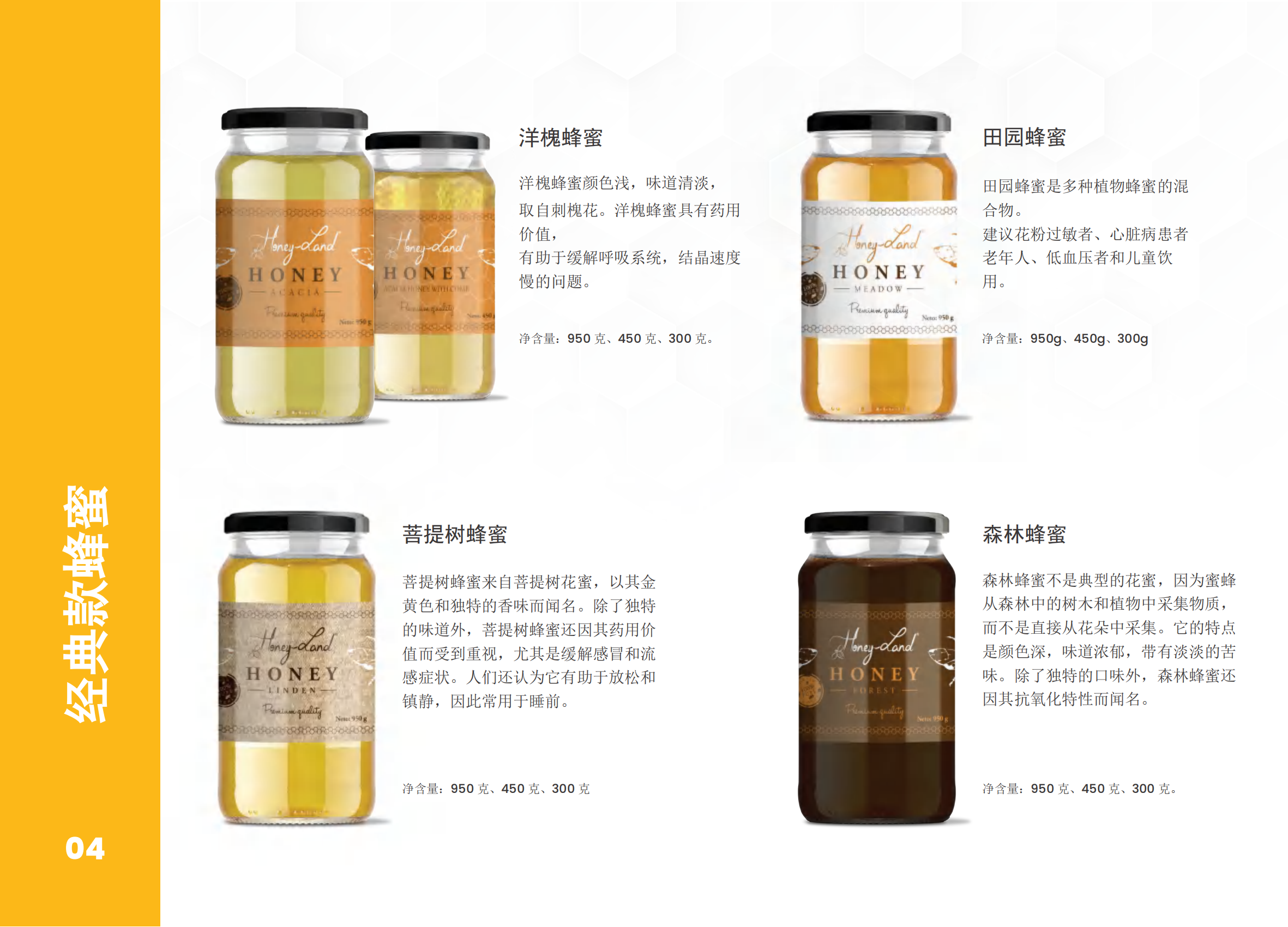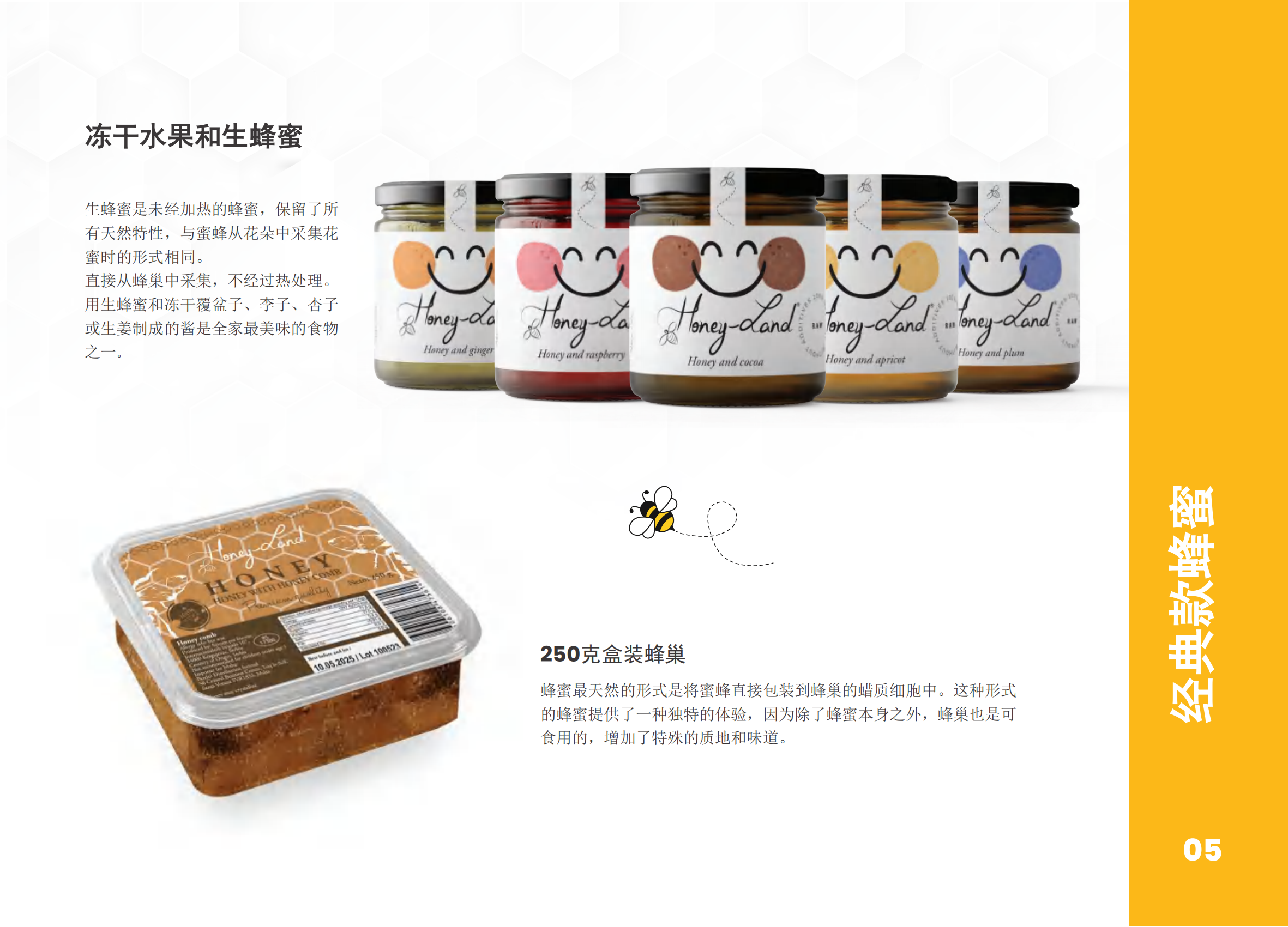 It mainly includes four basic flavors: acacia honey, linden tree honey, grassland honey and forest honey, and develops innovative forms such as freeze-dried fruit honey and cereal pollen at the same time. Each flavor reflects the characteristics of the local soil and land, laying the foundation for the brand flavor.