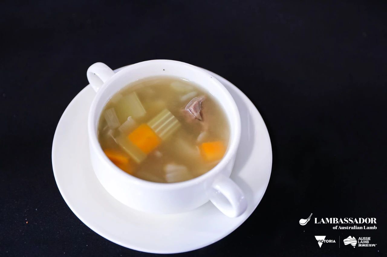 汤品选用了澳洲羔羊腿,并加入西芹、洋葱、土豆、胡萝卜、薏米及大量胡椒,慢火炖煮,汤汁融合了羔羊腿的肉香以及蔬菜的鲜甜,抿一口,便心生慰藉。