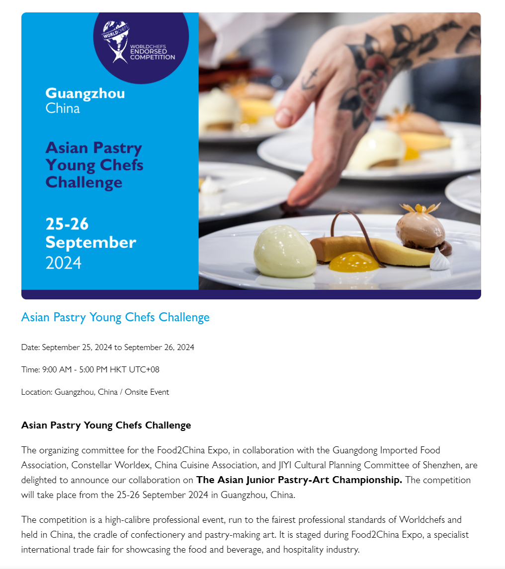 2024亚洲青年烘焙大赛(决赛)将于今年9月25日至27日与2024年中食展®(广州)暨广州国际食品食材展览会携手举办。此次盛会将与Food2China Expo广州国际食品饮料展览会、Wine to China酒展、广州(江南)国际果蔬产业博览会、广州国际渔业博览会六大展会同期同地——广交会展馆B区盛大启幕!