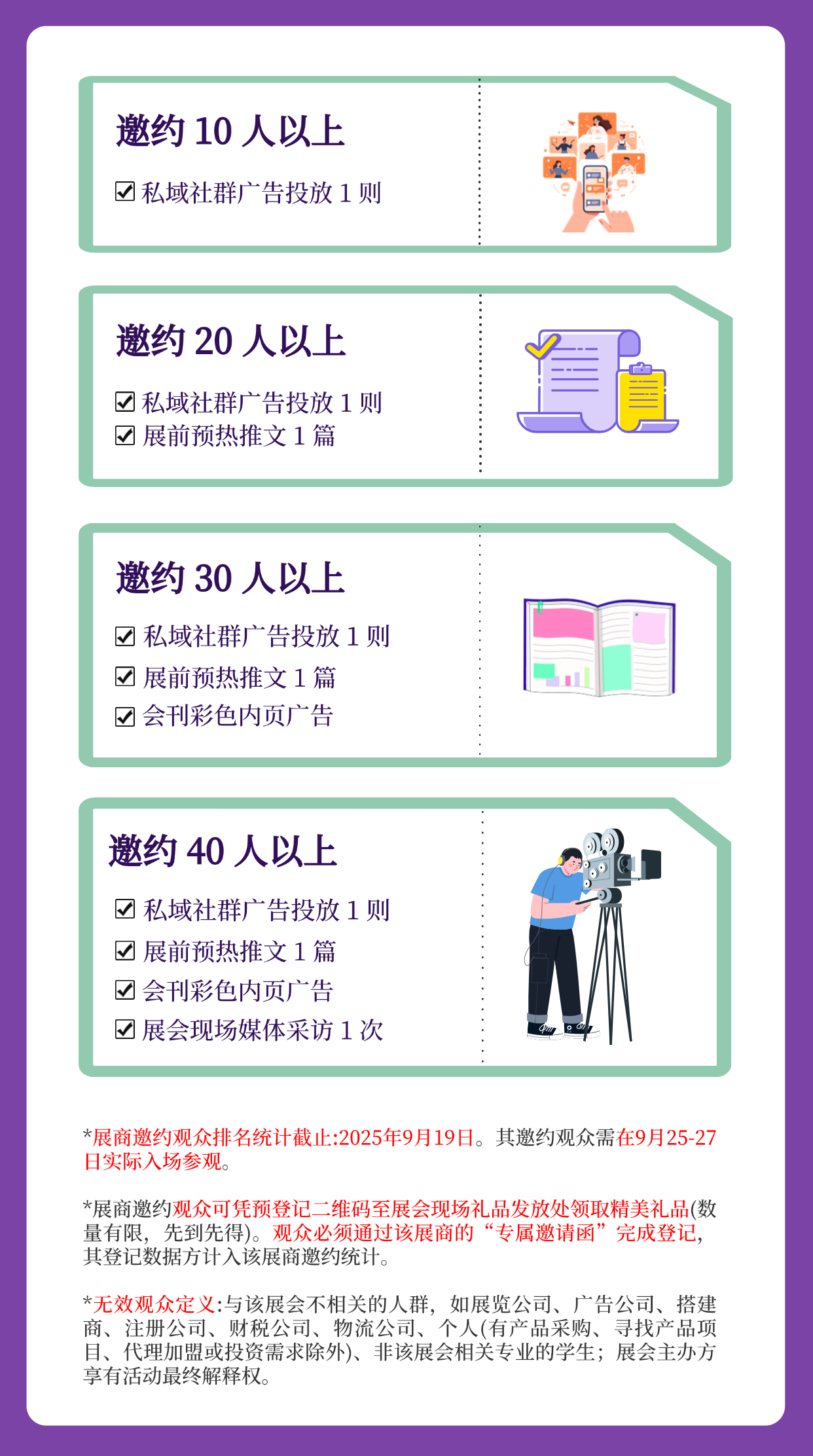 为强化展会商贸效果,组委会特设“展商邀约观众奖励”机制,通过您的专属海报二维码扫码登记的观众(本届展会企业员工不计入统计),将实时计入后台排名,达标即可解锁以下权益: