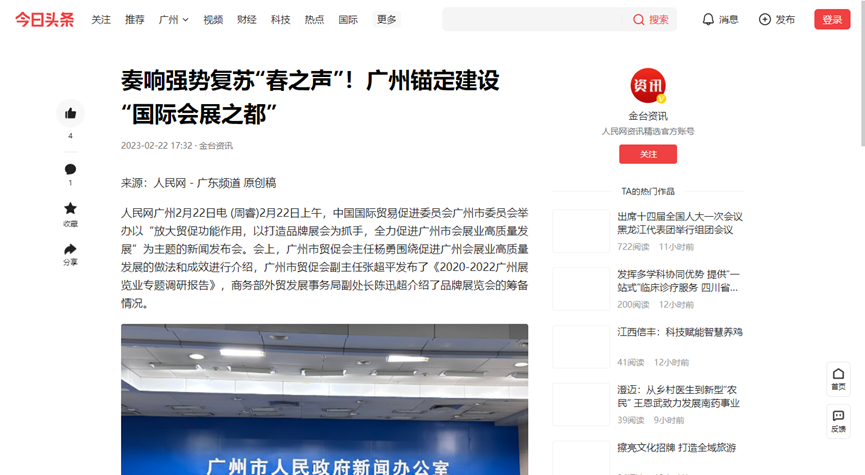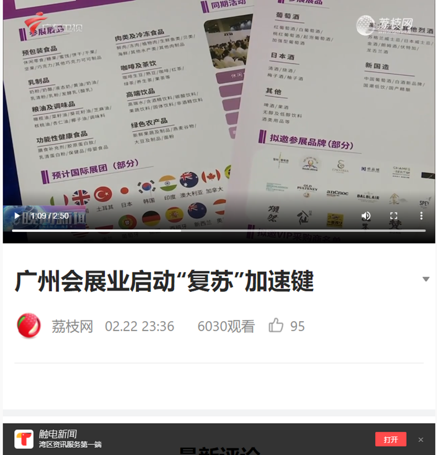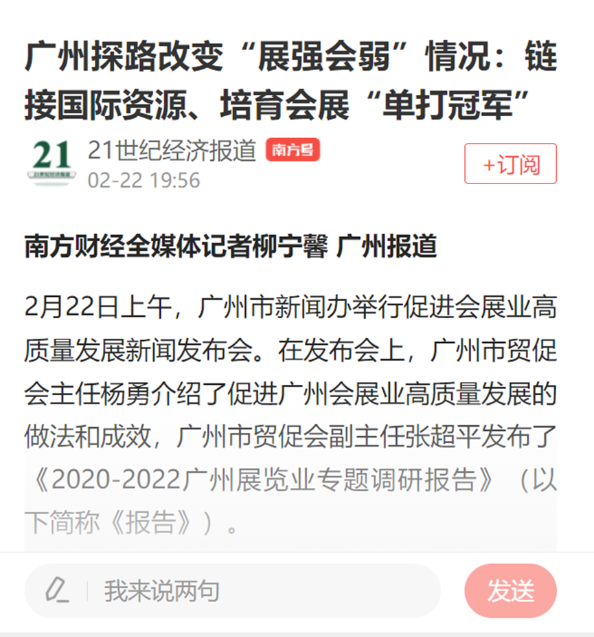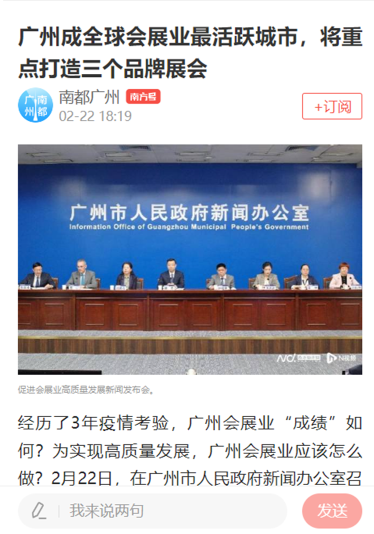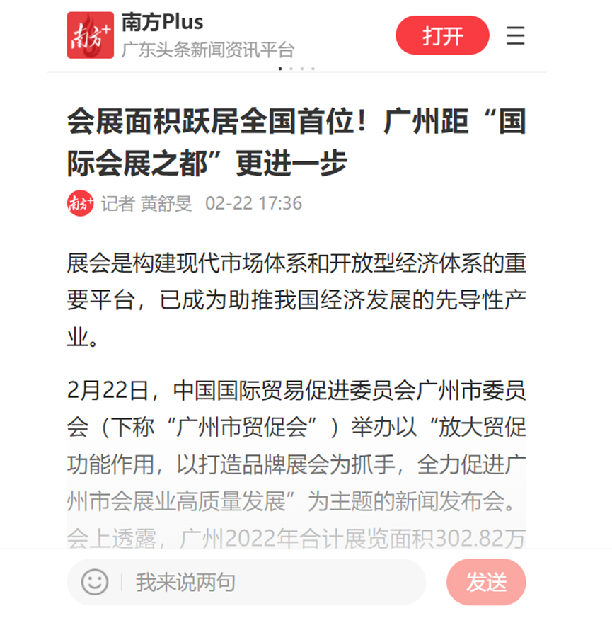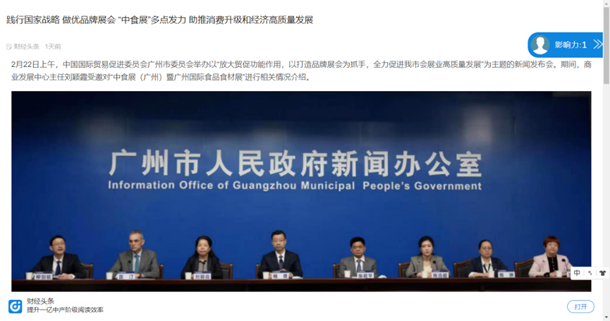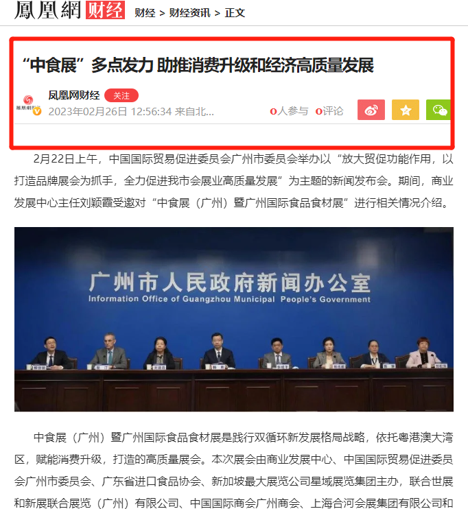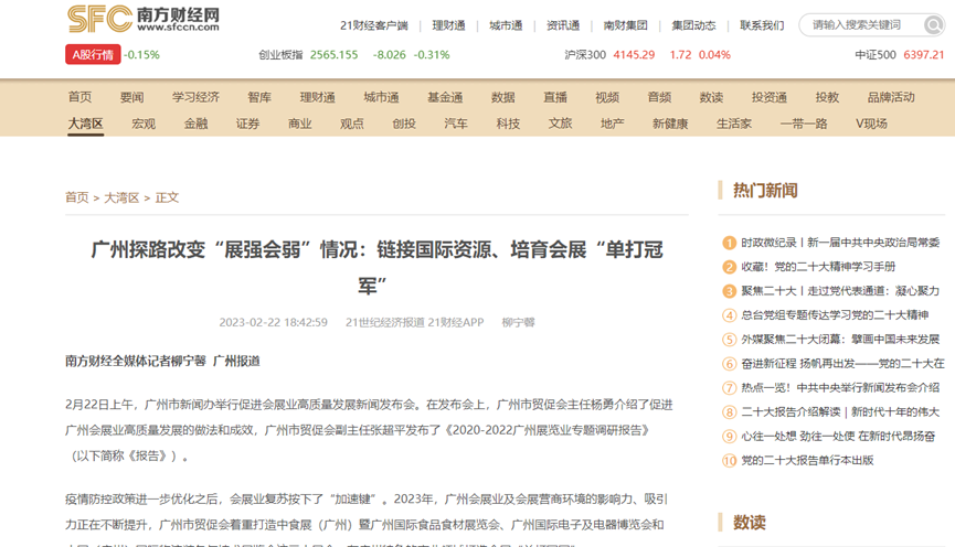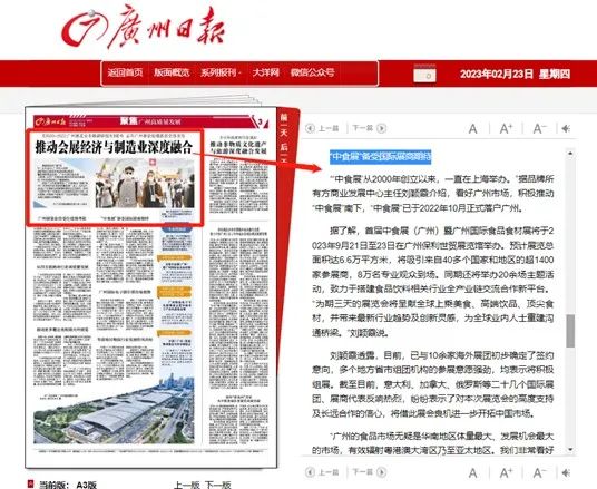 2023中食展(广州)成为广州今年重点打造的三个品牌展会之一,广州日报、南方都市报、南方Plus、南都广州、人民网、凤凰网财经、今日头条、财经头条、中国商务新闻网、21世纪经济等相关媒体纷纷报道。