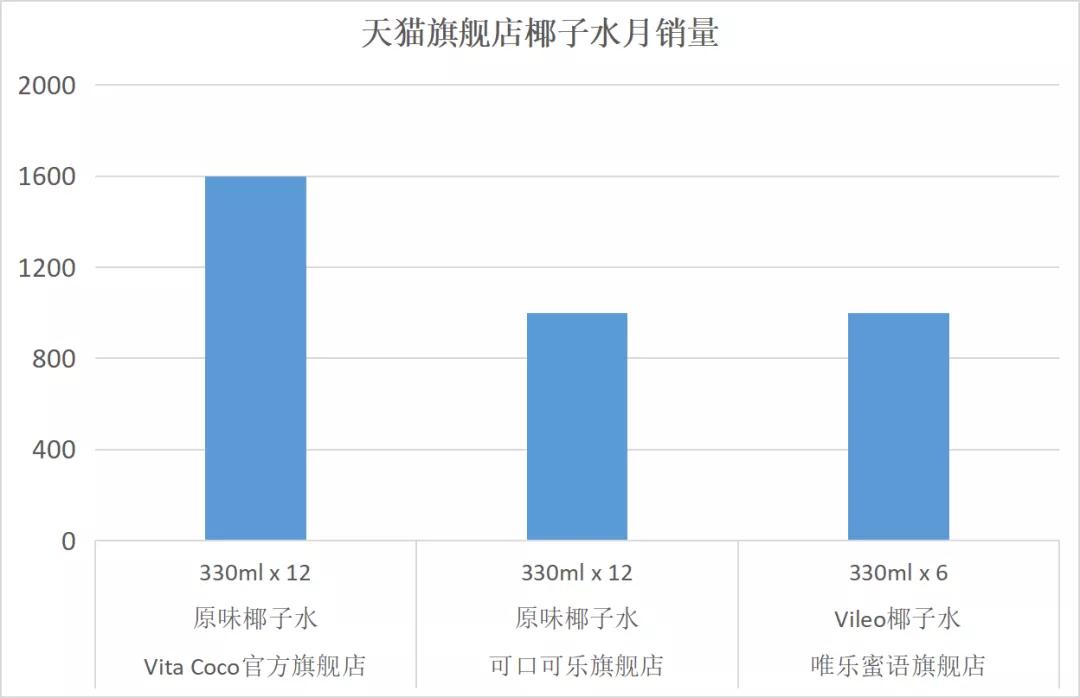 天猫超市的数据显示,VITA COCO是卖得最好的椰子水品牌,一箱330ml(12盒) 的月销量接近5000笔。其它相对热销的品牌是可口可乐旗下的ZICO椰子水和来自泰国的UFC,ZICO一箱330ml(12盒)的月销量约2800,而UFC一箱500ml(12盒)的月销量也有2200多。