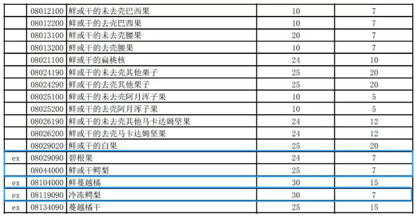 进口坚果类和部分进口水果的暂定税率对比最惠国税率,也有不同程度的优惠,部分品类的优惠幅度高达50%。其中,碧根果和类目为鳄梨的暂定税率与对应的最惠国税率相差幅度最大,详见下表: