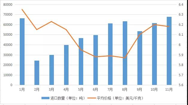 其中,11月份中国进口暖水虾6.8万吨,冷水虾8000吨,分别比2019年10月份增长10%和60%。与2019年10月相比,中国进口虾的平均单价总体上相对稳定,其中进口暖水虾的平均单价下降0.02美元,至每千克6.18美元。